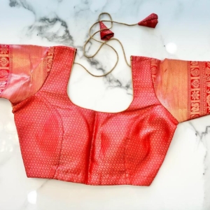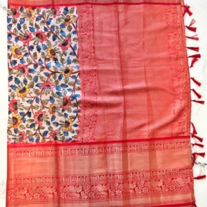 Fancy Silk Light Lilac kalamkari Saree with Kanchi Zari Contrast Red Border and Blouse