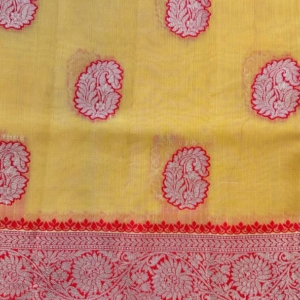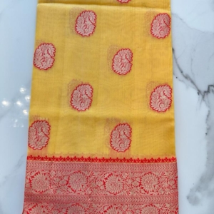 Fancy Silk Mango Design Yellow Color Saree with Contrast Red Color Border and Rich Pallu