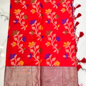 Fancy silk orangish red saree with contrast purple border