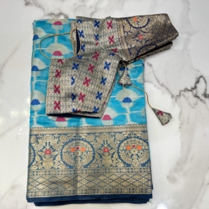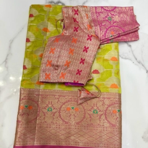 Enriched premium Organza Silk Saree With Rich golden Zari Woven Pallu & Zari & Meena weaving contrast Border With Beautiful Meenakari motifs weaving all over the Saree with Designer Brocade Silk blouse piece