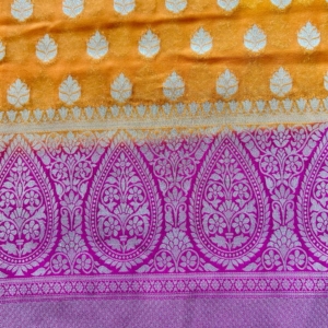 Pure Georgette Leaf Border Mustard Yellow color saree with Contrast Pink color Leaf Border